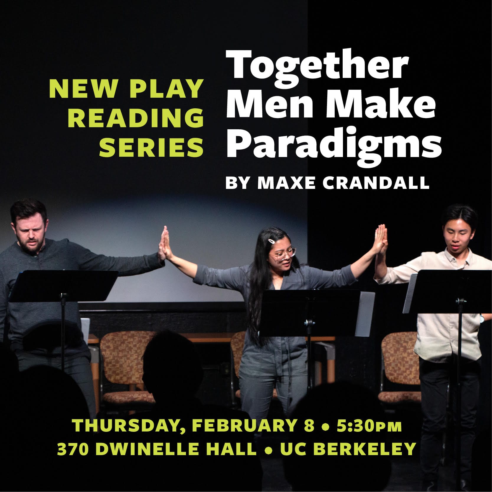 I am SO excited that Evan Sakuma and I are resurrecting the UC Berkeley New Play Reading Series this spring! Our three-part series kicks off this Thursday (yes, that's tomorrow) with the play Together Men Make Paradigms by Maxe Crandall! This is a free reading at 5:30 pm on UC Berkeley campus.